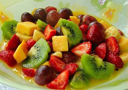 La manzana, las peras, las mandarinas, las naranjas, los kiwis, se cortan en trozos.Se ponen en un bol alto.